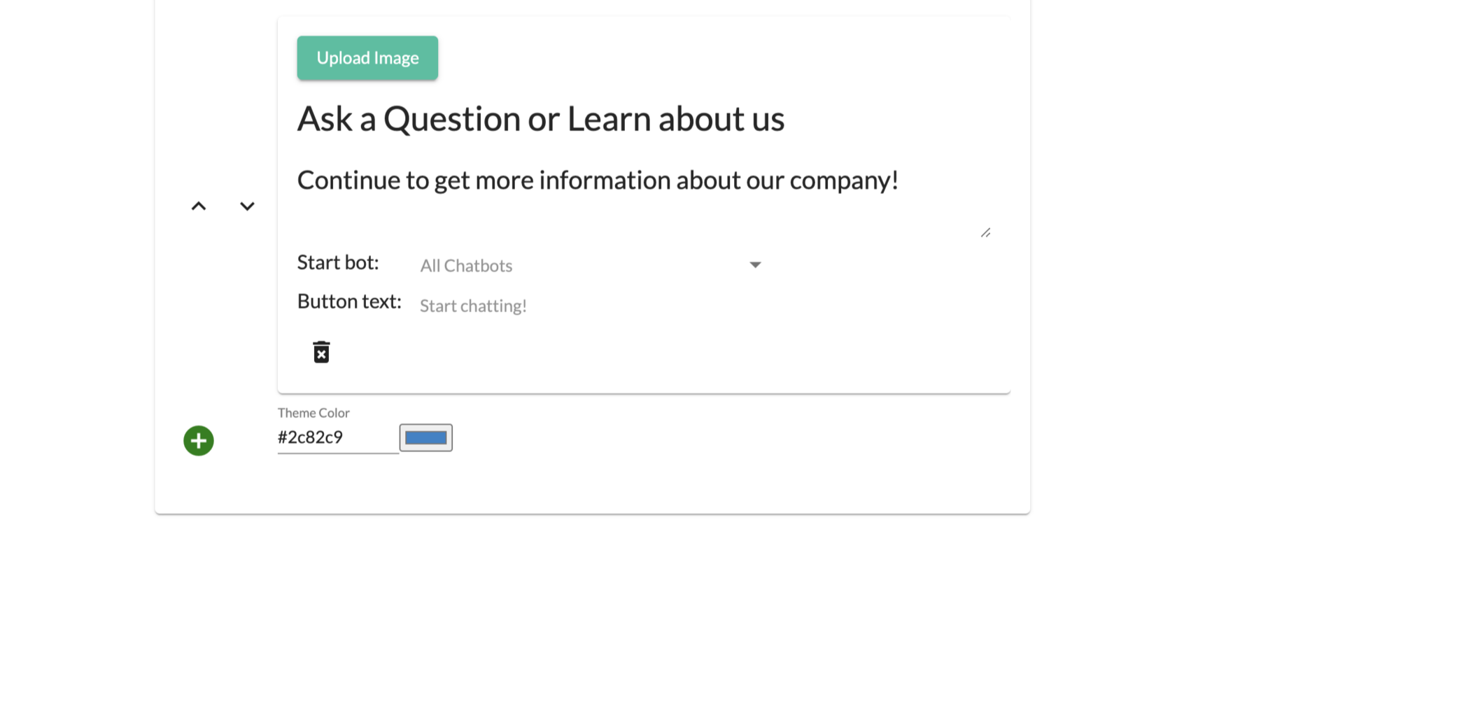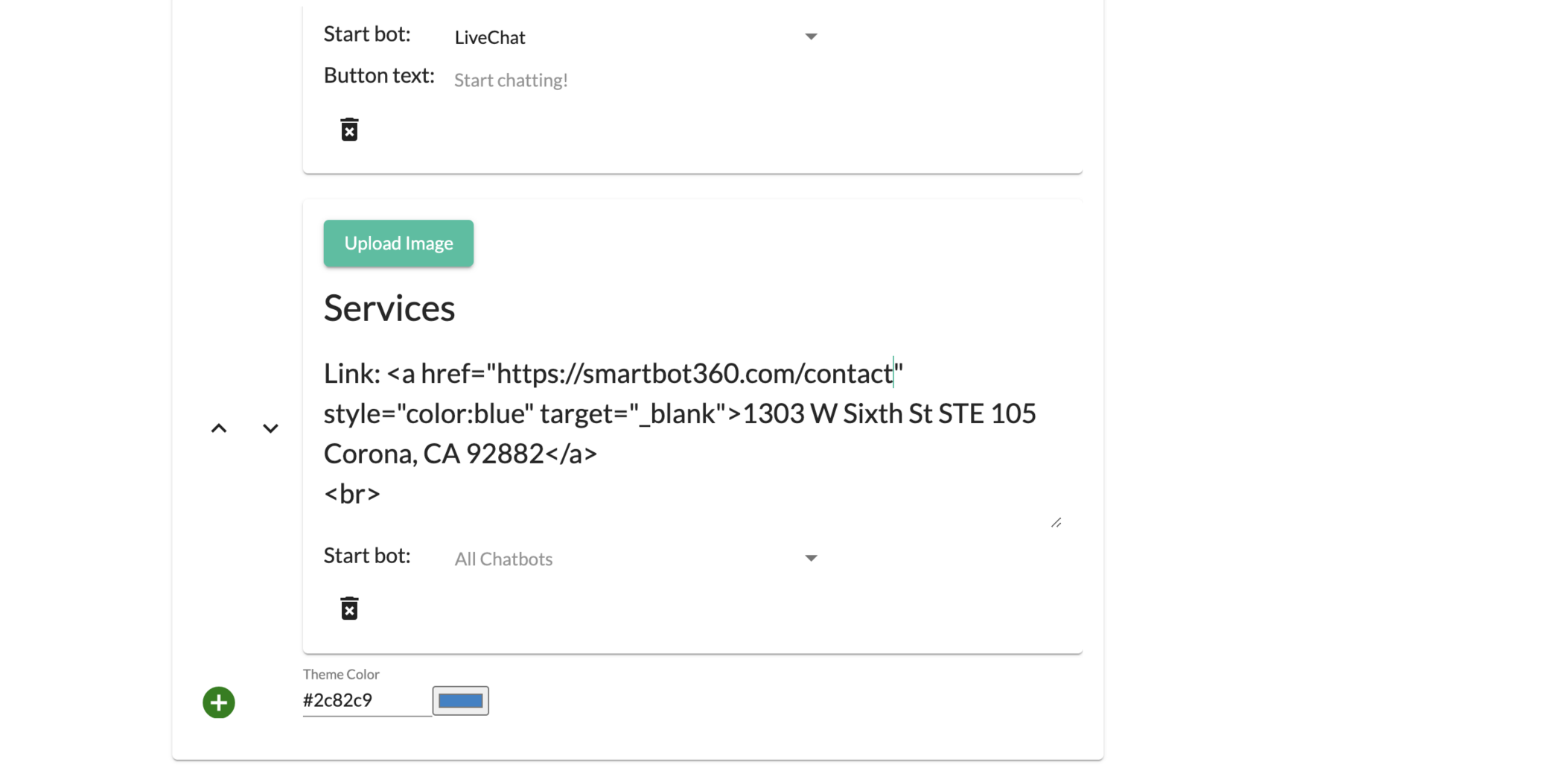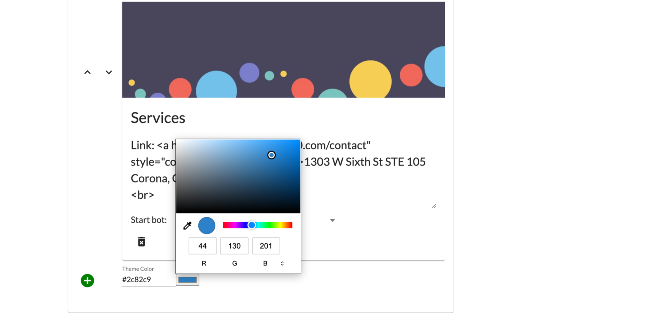 Lastly, let’s change the theme color of our bot. Simply add the hex code for your desired color, or click the color box and choose a color. If left blank, we will use our default color.