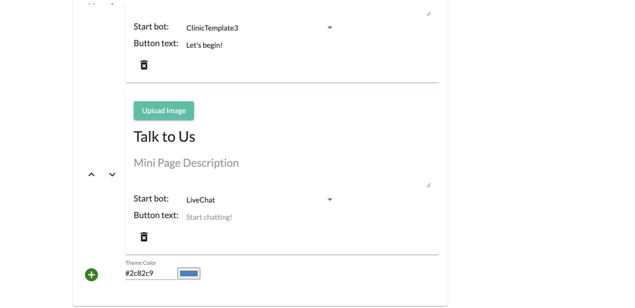 Next we will add a second page by clicking the green ‘+’ on the bottom left of the screen. We select the LiveChat template bot (make sure you import it from the templates earlier).
