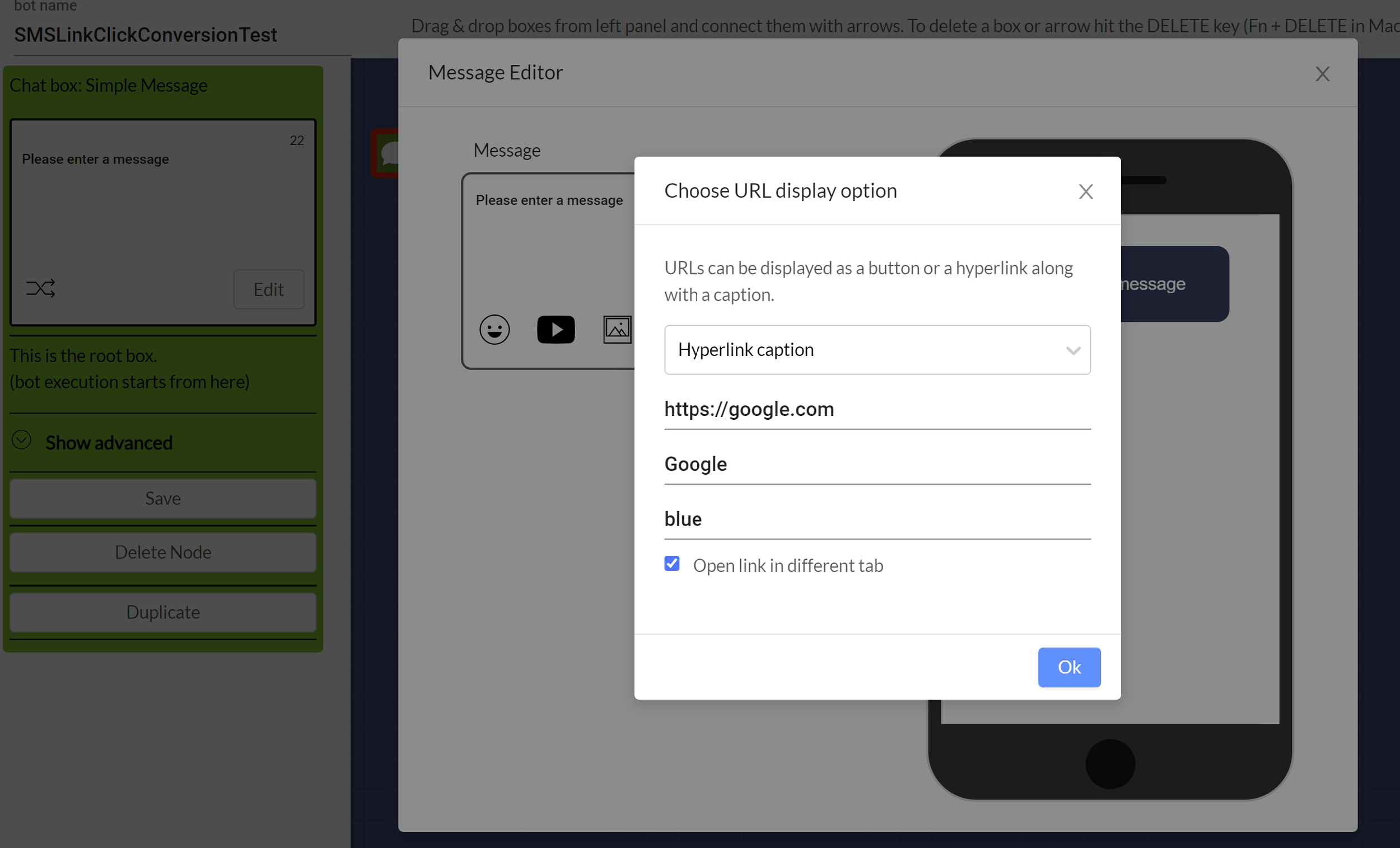 To insert a URL in a chatbot, select a box, click on the Edit button in the message box, and click on the hyperlink button, as shown below.
