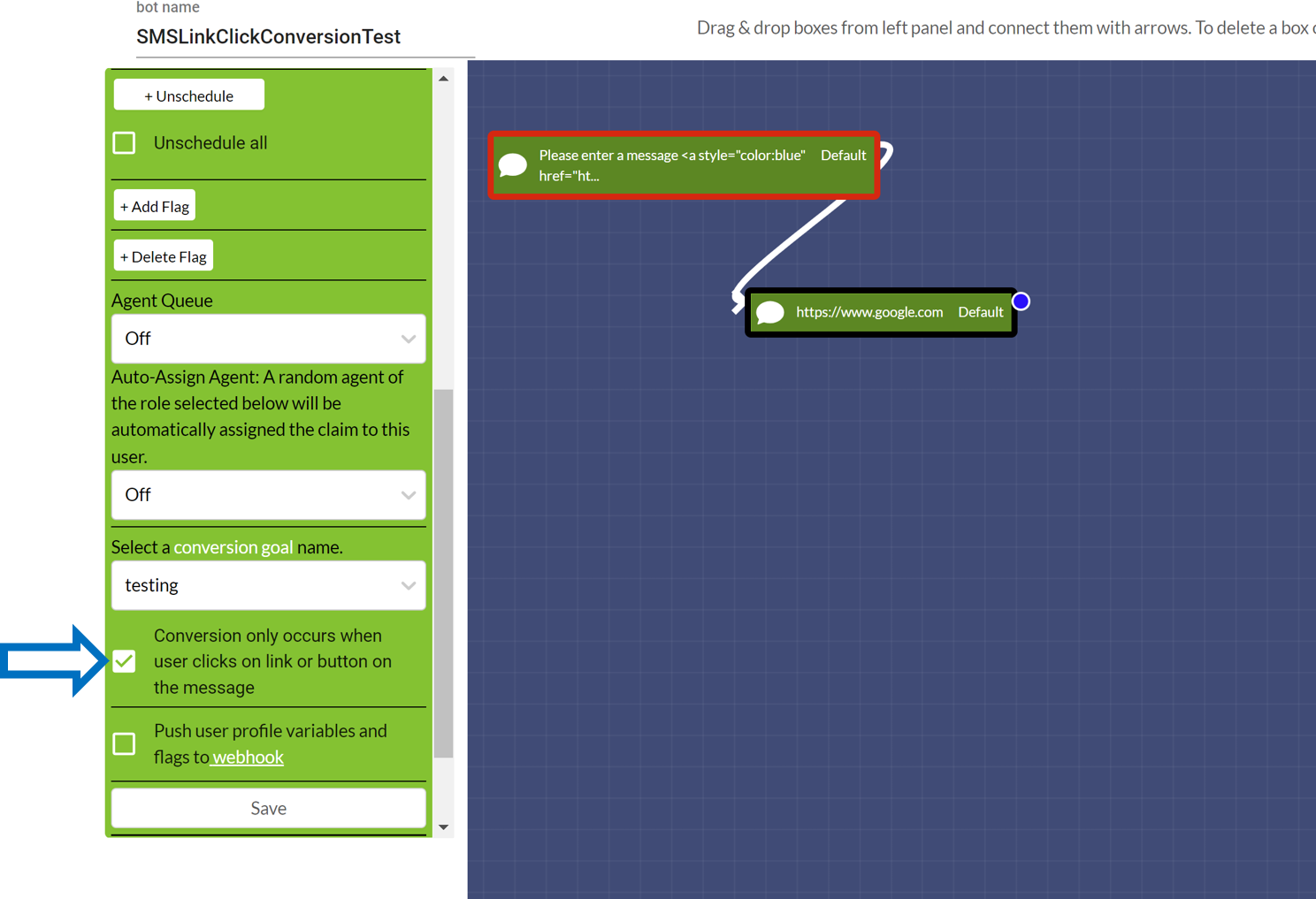 You can also track URL clicks as chatbot conversions. To do that, select the conversion goal and check the URL Click tracking button as shown below. Once you do that, you can view the daily conversions in the ANALYTICS page as usual.