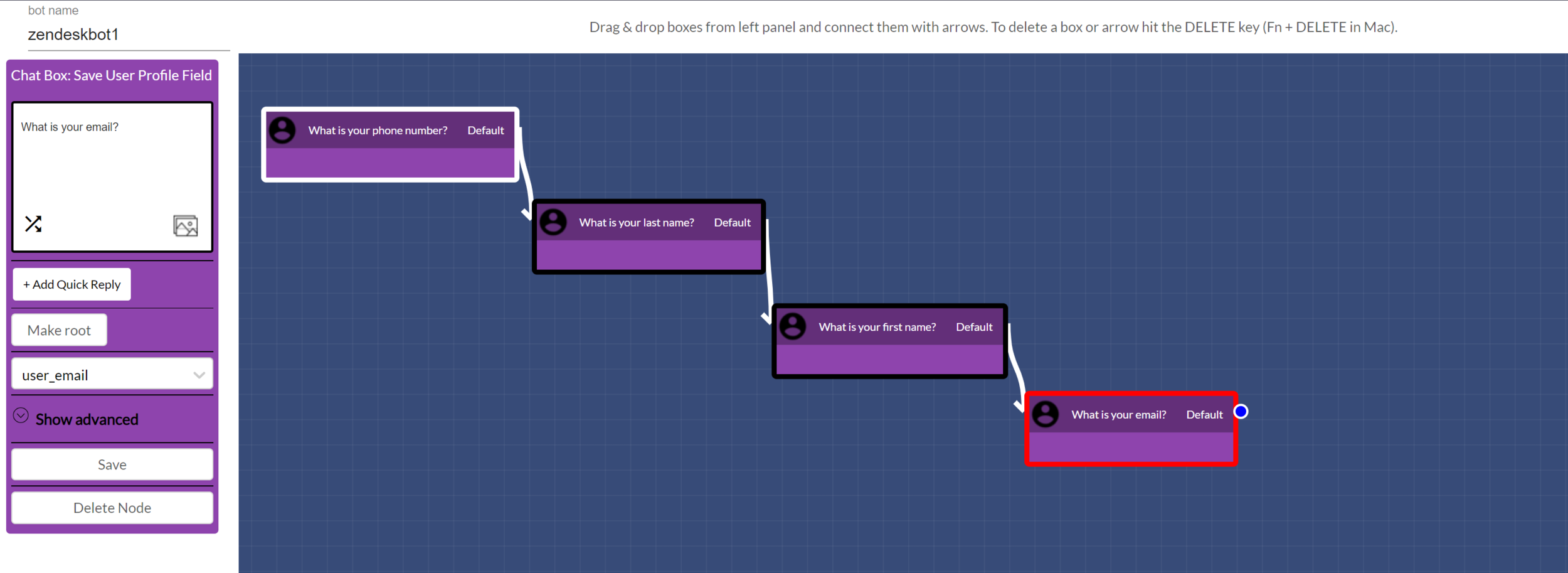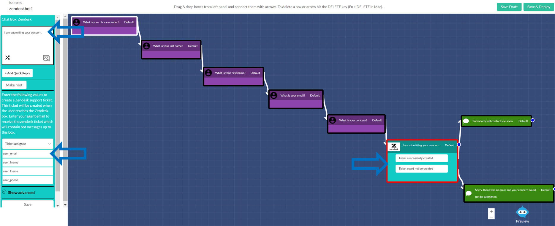 Then, add a Zendesk box as shown below. Note that the four variables (user_email, user_fname, user_lname, user_phone) were collected in the first four boxes of the diagram. Only one of first or last name is needed, as they are concatenated into one name before submitting to Zendesk. When the bot execution reached the Zendesk box, SmartBot360 will create a Zendesk ticket for the end user specified in the four fields, with the whole conversation up to that box as the ticket content.