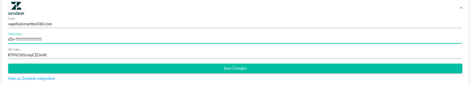 First, go to the SETTINGS page, and under Integrations select Zendesk. Specify your Zendesk account information as shown below.